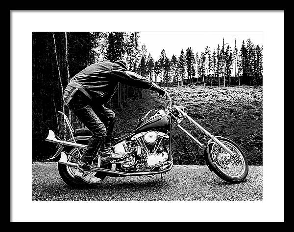 Detta svartvita fotografi fångar ett kraftfullt och tidlöst ögonblick: en motorcykel förare som kickstartar en långgafflad chopper ute på en ödslig landsväg. Den råa kroppstyngden över pedalen, den utsvängda gaffeln och motorns blanka metall ytor skapar en bild fylld av energi och autenticitet.