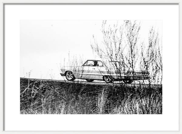 Denna svartvita fotokonst fångar en klassisk lowrider i rörelse längs en landsväg, delvis dold bakom dansande gräs och buskage.