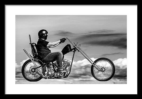Svartvitt kvalitets fotografi. Harley Davidson Chopper åker på med moln i bakgrunden. Nostalgi bild.