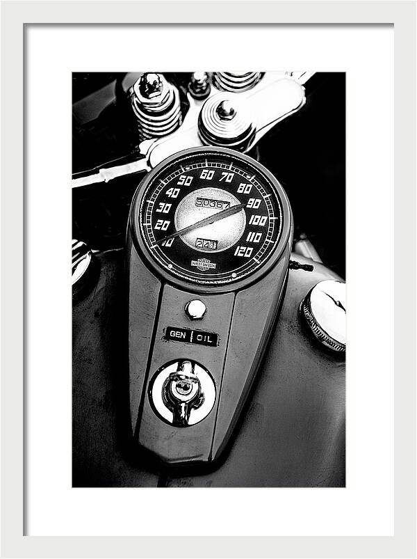 Svartvitt kvalitets fotografi av Harley Davidson hastigmätare och bensintank. Retro.