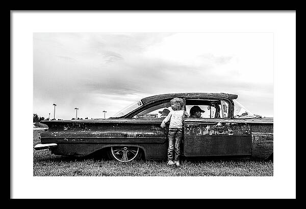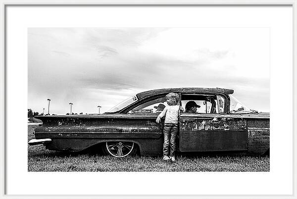 Upptäck en stämningsfull svartvit fotografi som fångar mötet mellan generationer vid en klassisk, lågt stående amerikansk bil med vacker patina. Bilden förmedlar nostalgi, bilkultur och äkta ögonblick – perfekt som väggkonst i garage, mancaves, vardagsrum eller för dig som älskar retrobilar och dokumentär fotografi.