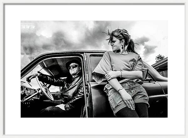 Förhöj känslan i ditt hem, garage eller mancave med denna unika svartvita fotokonst. Bilden skildrar en klassisk bil i centrum, med två personer som bidrar till en stilren och retroinspirerad rockabillyatmosfär. Den dramatiska himlen och bilens linjer ger motivet både attityd och nostalgi.