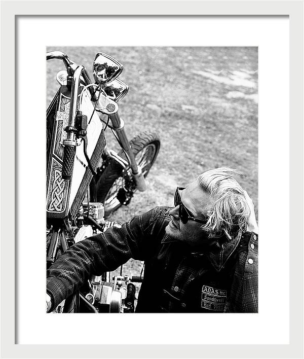 Svartvitt kvalitets fotografi med Harley Davidson Chopper och ägaren med mörka glasögon.