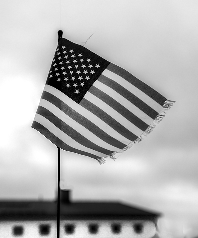 Stilren svartvit fotokonst med den amerikanska flaggan. En stark symbol för frihet. Amerikansk attityd.