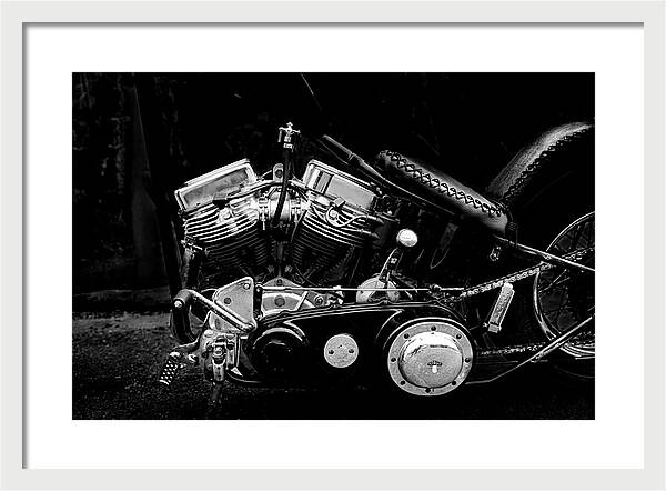 Detta kraftfulla svartvita fotografi fångar hjärtat i en klassisk custom-motorcykel – en rå, detaljerad motor i närbild med metalliska strukturer, texturer och mekaniska former som framträder tydligt i det dramatiska ljuset.